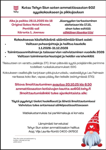 Syyskokoukseen ja pikkujouluun ilmoittautumislinkki on tuossa vasemmalla Ajankohtaista palstalla.